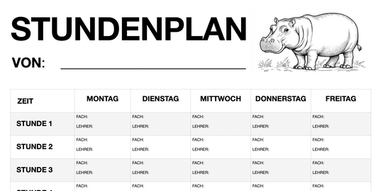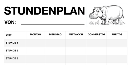 Stundenplan für Schüler - Motiv: Hippo (PDF, sofort ausdruckbar)