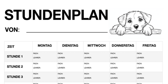 Produktbeschreibung Unser Stundenplan im fröhlichen Hunde Motiv ist der ideale Begleiter für Schüler jeden Alters, um den Schulalltag strukturiert und übersichtlich zu gestalten. Dieses sofort ausdruckbare PDF-Dokument ist in drei verschiedenen Versionen erhältlich, die je nach...Regulärer Preis €1,99Schnellansicht -